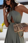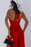 Turn heads wherever you go with our Halter Neck Wide Leg Jumpsuit, designed for bold elegance and effortless sophistication. Featuring a flattering halter neckline with a front keyhole cutout and an open back with crisscross straps, this jumpsuit brings a perfect blend of class and allure.